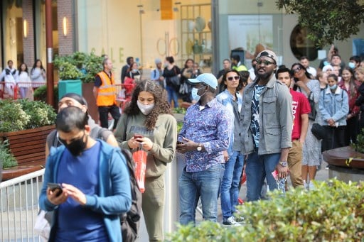 | 20일(현지시간) 런던 동쪽 웨스트필드 쇼핑센터에서 사람들이 매장 입장을 위해 줄서있다. 쇼핑센터 등 비필수사업장들은 3개월간 봉쇄조치로 영업을 하지 못했으며, 이날은 영국 정부가 비필수사업장에 봉쇄해제 조치를 내린 이후 맞은 첫번째 토요일이었다./사진=AFP |