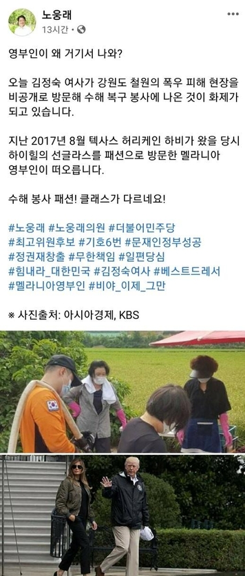 노 의원은 12일 자신의 페이스북에 김 여사의 강원도 철원 수해 봉사 사진과 멜라니아 여사의 사진을 나란히 올리면서 "오늘 김정숙 여사가 강원도 철원의 폭우 피해 현장을 비공개로 방문해 수해 복구 봉사에 나온 것이 화제가 되고 있다"고 적었다.